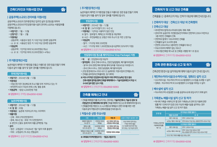 [고령=박병상 기자] 경북 고령군(군수 이남철)은 건축디자인과에서 진행하는 주거환경개선사업, 건축 및 개발행위허가에 관한 내용과 허가·신고절차 등을 안내 리플렛으로 제작하였다.