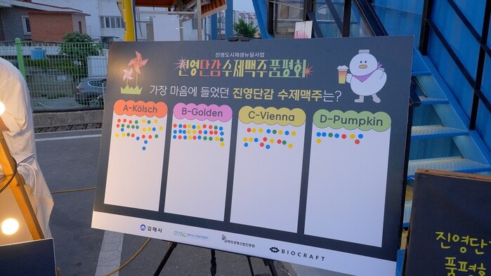 “진영맥주(가칭)”는 진영의 단감에서 발견한 효모(균주)를 통해 수제맥주 4종의 레시피를 개발, 진영주민 및 김해시민을 대상으로 최고의 맛 1종을 선택하기 위한 품평회를 지난 24일, 25일 진영바람개비야시장, 제1회 김해한우축제 행사장에서 양일간 개최해 눈길을 끌었다.