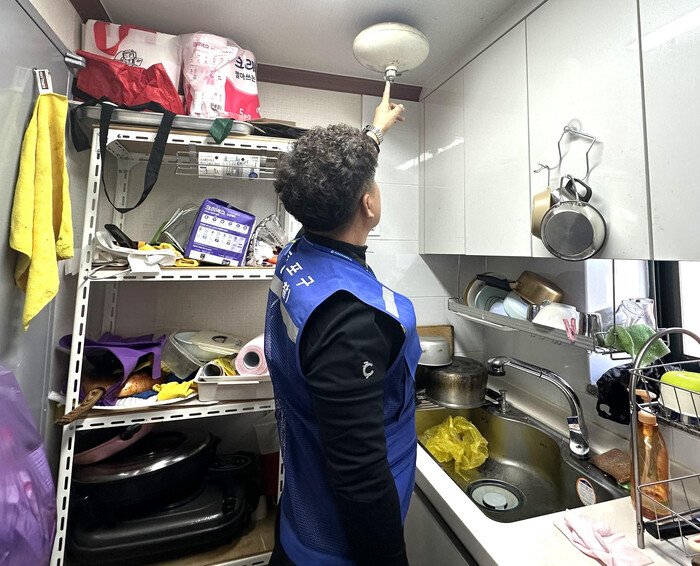 | ▲ 경로당 천장에 달린 화재예방 장치를 확인하고 있는 모습. (사진=영등포구청 제공) |