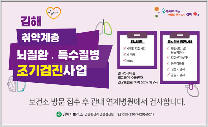 뇌 질환 검진 사업은 MRI(뇌경색, 뇌종양 발견) 또는 MRA(뇌출혈, 뇌 동맥 류, 뇌 혈관 협착 을 발견) 검진비 본인 부담금 (최대 24만원)을 지원하며, 전립선 암 (남), 난소암(여), 갑상선 기 능 검사, 동맥경화도, 심전도, 골밀 도 검사를 본인 부담금 없이 지원하는 특수 질환 검진 사업도 같이 시행한다.