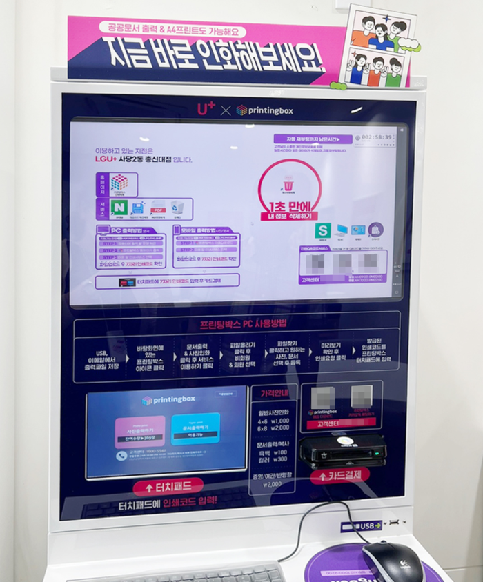 ㈜프린팅박스는 상단의 PC 사용과 정품 인화지를 사용한 사진인화, 문서 출력 등 모든 서비스 이용이 가능토록 한 사진, 문서 출력 서비스를 올해 3월 LG유플러스 종각점을 시작으로 도입하고 있는 중으로, 올해 LG유플러스 지점 100곳에 해당 키오스크 설치를 목표로 한다는 방침이다.