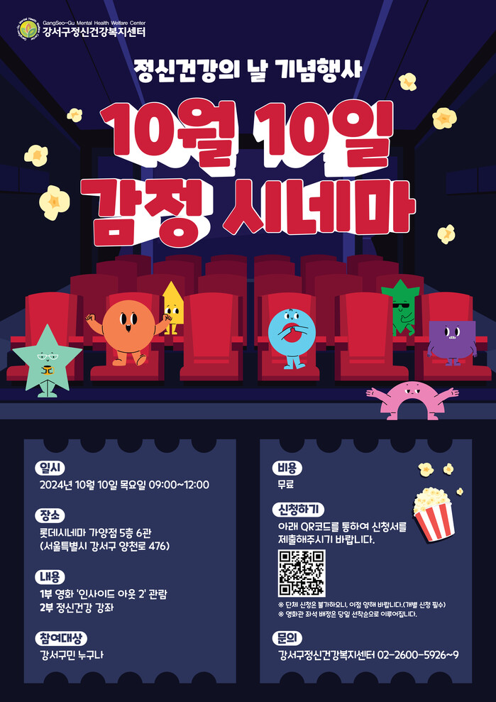 [시민일보 = 박소진 기자] 강서구(구청장 진교훈)와 정신건강복지센터는 오는 10일 세계 정신건강의 날을 맞아 주민들의 정신건강 증진을 위한 행사 ‘정신건강의학과 의사와 함께하는 감정 시네마’를 개최한다.