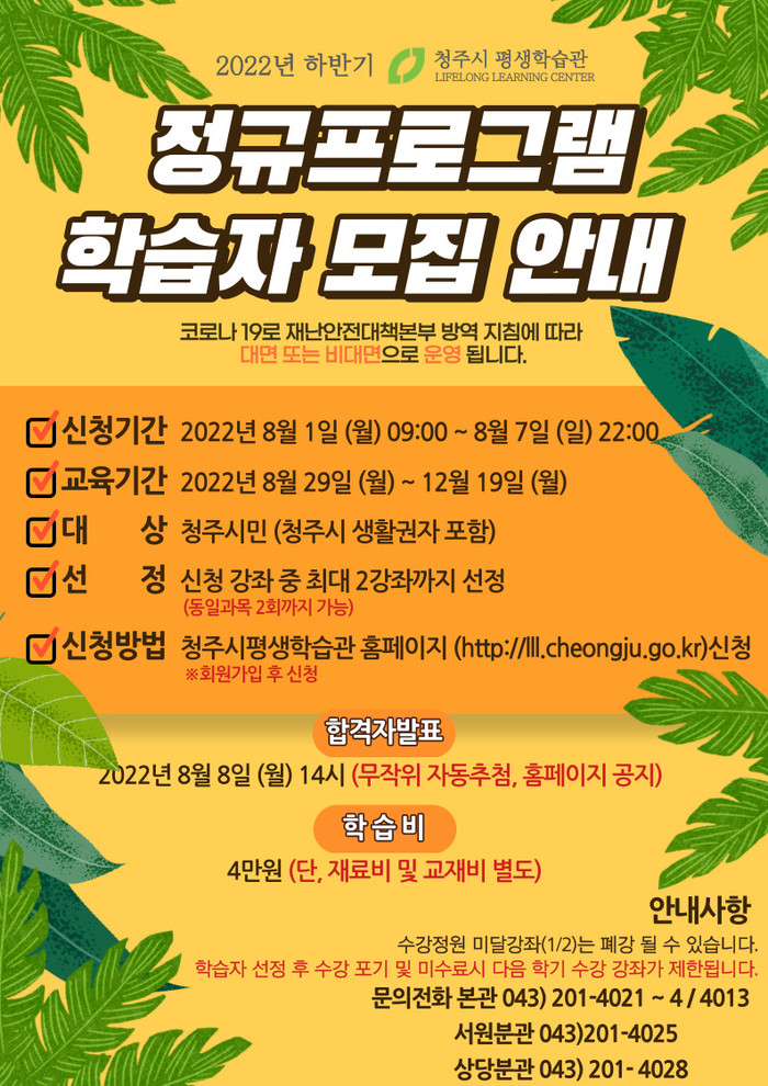 신청 및 접수기간은 오는 8월 1일부터 7일까지 7일간으로, 청주시평생학습관 홈페이지를 통해 신청할 수 있다.