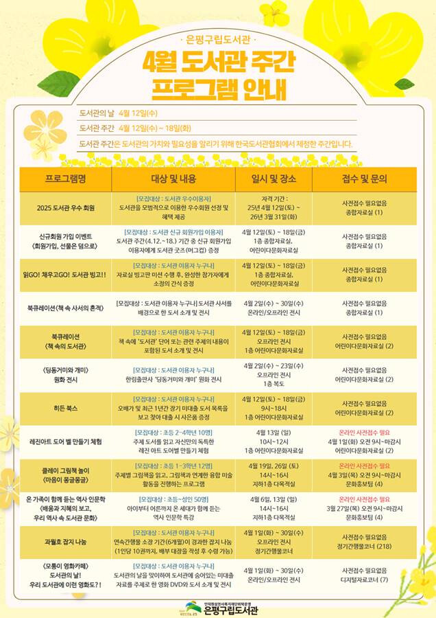 일부 프로그램은 사전 신청이 필요하며, 자세한 내용은 은평구립도서관 누리집이나 도서관 종합자료실로 문의하면 된다.