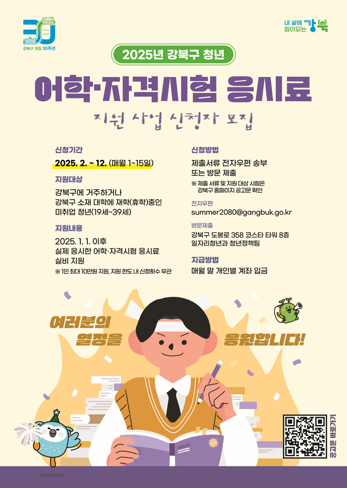 응시료 지원을 받고자 하는 청년들은 신청서, 개인정보 수집·이용 동의서, 주민등록표 초본 등 필수 서류를 갖춰 구청 일자리청년과를 방문하거나 담당자 이메일로 제출하면 된다. 보다 자세한 사항은 강북구청 홈페이지에서 확인할 수 있다.
