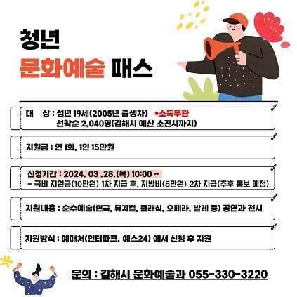 청년문화예술패스는 문화체육관광부와 한국문화예술위원회 주관하에 청년의 문화 향유기회 제공과 문화예술시장 활성화를 위해 사회에 첫 발을 내딛는 대한민국 청년에게 순수예술 관람비를 지원하는 사업이다.