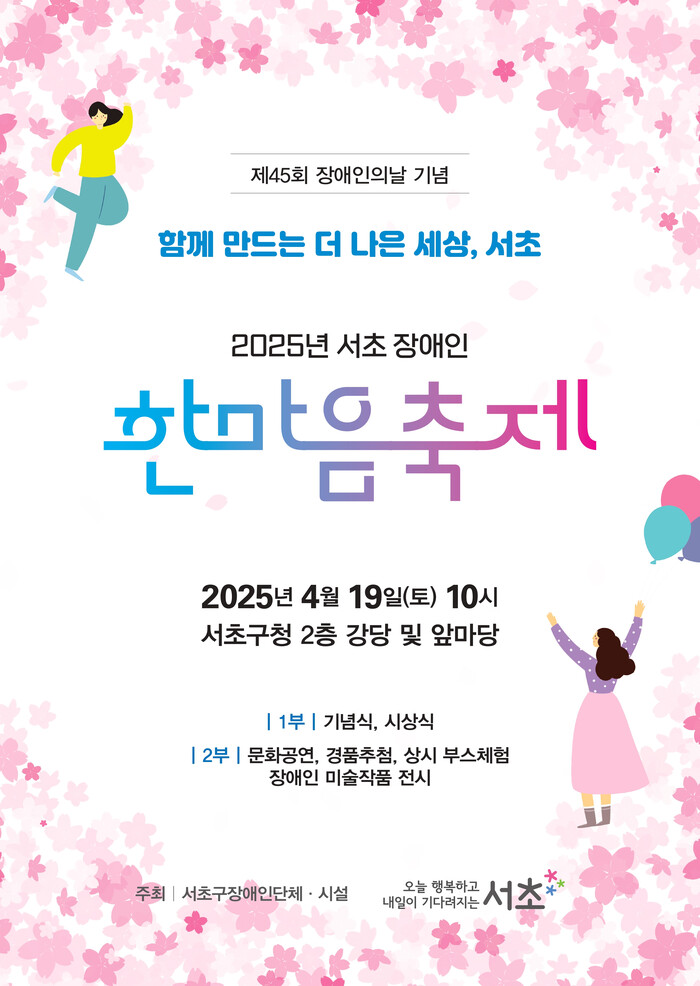 [시민일보 = 박소진 기자] 서초구(구청장 전성수)가 오는 19일 제45회 장애인의 날(4월20일)을 맞아 장애인과 비장애인이 함께하는 ‘2025년 서초장애인 한마음축제(함께 만드는 더 나은 세상, 서초)’를 서초구청 2층 강당 및 앞마당에서 개최한다고 밝혔다.