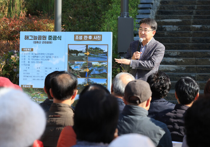 | ▲ 오승록 노원구청장이 12일 오후 노원구 월계동 산120-5일대에서 진행된 ‘해그늘공원 준공식’에 참석해 인사말을 하고 있다. (사진=노원구청 제공) |