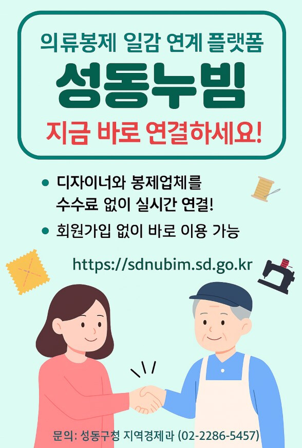 [시민일보 = 박소진 기자] 성동구(구청장 정원오)는 관내 의류·봉제업체에 안정적인 일감을 제공하고, 디자이너가 제작처를 쉽게 찾을 수 있도록 온라인 플랫폼 ‘성동누빔’을 운영하고 있다고 밝혔다.