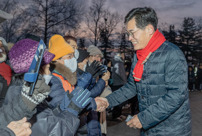 | ▲ 2024년 양천구 용왕산 해맞이 축제에서 이기재 구청장(오른쪽)이 구민과 소통하고 있다. (사진=양천구청 제공) |