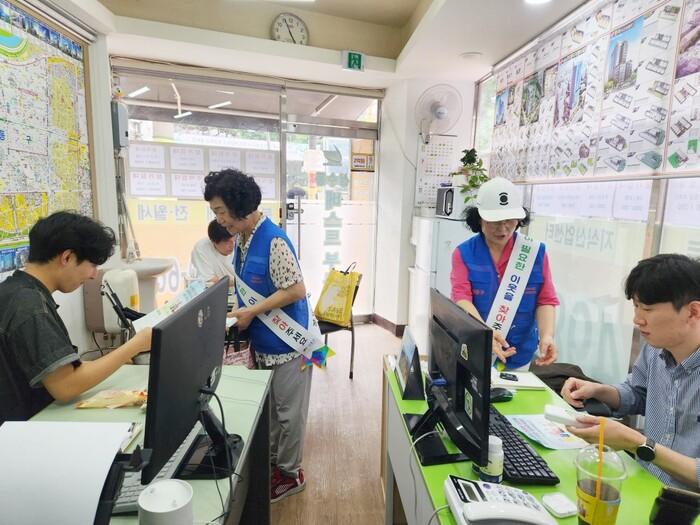 | ▲ 성수1가제1동 지역사회보장협의체 회원들이 부동산 등 생활업종 종사자를 대상으로 명예사회복지공무원 활동에 대한 참여 홍보를 하고 있다. (사진=성동구청 제공) |