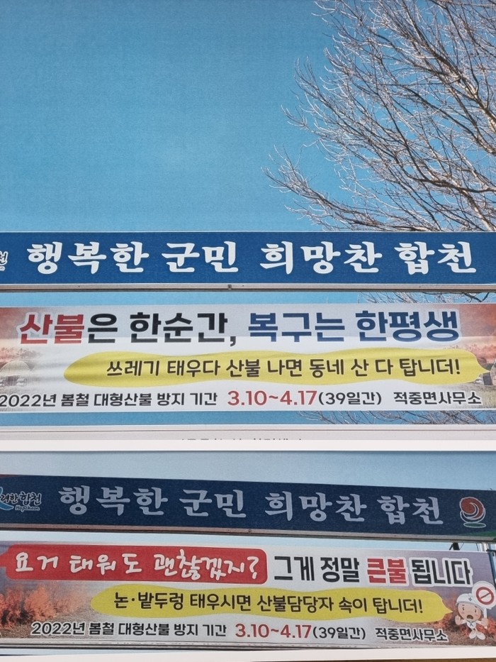 적중면은 주민 왕래가 많고, 눈에 잘 띄는 지정 게시대에 산불예방 현수막을 게첨했고, 해당 현수막은 딱딱한 문구가 아닌 친근하고 애교형으로 완곡하게 표현해 주민 동참을 호소하고 있다.