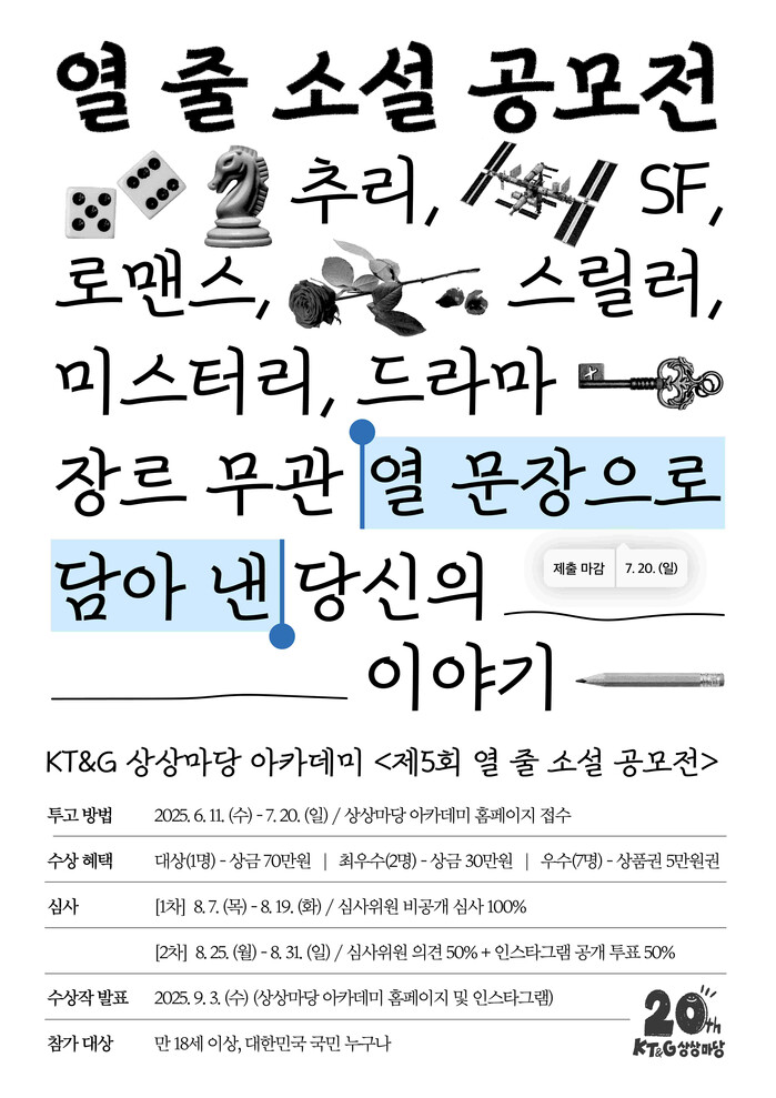 [시민일보 = 문민호 기자] KT&G 상상마당이 문학 저변 확대를 위한 ‘제5회 열 줄 소설 공모전’의 참가자를 오는 7월 20일까지 공개 모집한다.