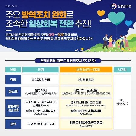이번 조치는 WHO(세계보건기구)의 공중보건위기 상황(PHEIC) 해제와 국내 확진자 수 감소 및 방역 안정화 등에 따른 변화를 통해 빠른 일상 회복 전환에 총력을 다하고자 한다.