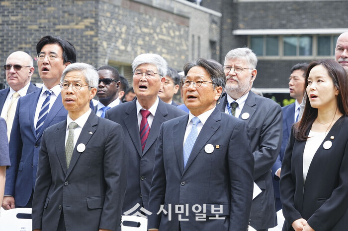 | ▲ 강기정 광주광역시장이 10일 서울 용산구 민주화운동기념관(옛 남영동 대공분실)에서 열린 ‘제38주년 6·10민주항쟁 기념식 및 민주화운동기념관 개관식’에 참석해 민주주의를 향한 염원을 담은 노래 ‘그날이 오면’을 제창하고 있다. /광주광역시 제공 |