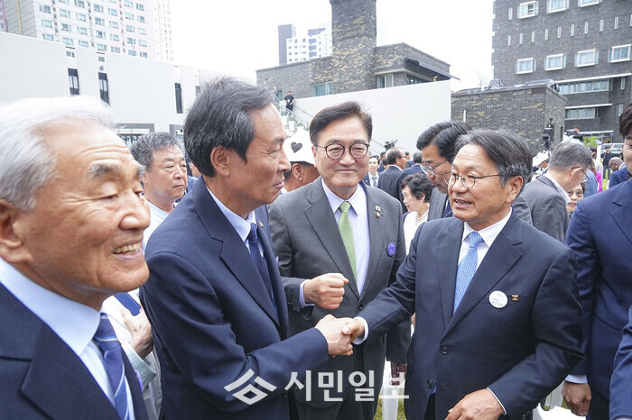 | ▲ 강기정 광주광역시장이 10일 서울 용산구 민주화운동기념관(옛 남영동 대공분실)에서 열린 ‘제38주년 6·10민주항쟁 기념식 및 민주화운동기념관 개관식’에 참석해 우원식 국회의장, 우상호 대통령실 정무수석, 이재오 민주화운동기념사업회 이사장 등 내빈들과 인사를 나누고 있다. /광주광역시 제공 |