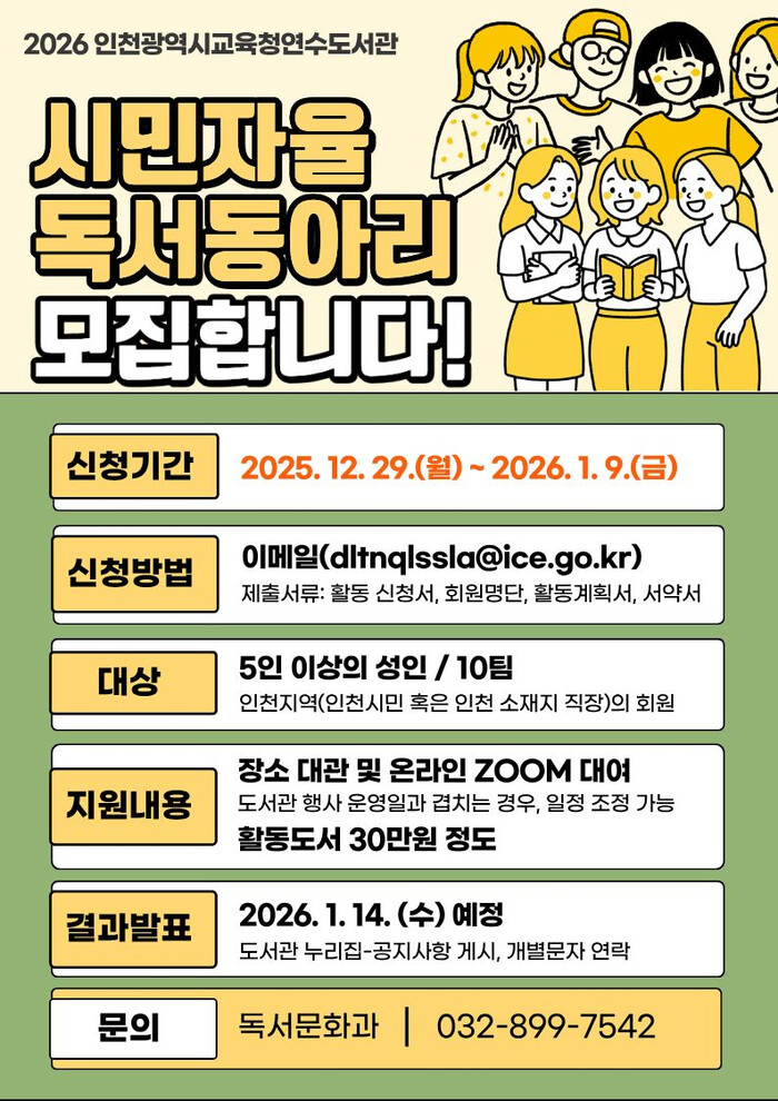 [인천=문찬식 기자] 인천광역시교육청연수도서관(관장 서경희)은 시민의 자발적인 독서활동을 지원하고 독서생활화를 확산하기 위해 ‘2026년 시민자율독서동아리’를 모집한다.