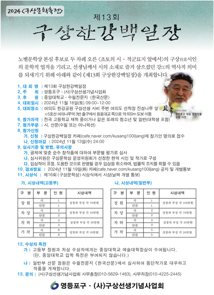 | ▲ ‘제13회 구상 한강백일장’ 안내 포스터. (사진=영등포구청 제공) |