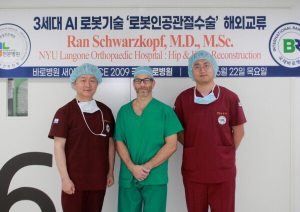 | 국제바로병원 정진원 병원장 인공관절팀이 뉴욕대 랭곤 정형외과 닥터 슈왈츠코프 박사 초청, 로봇 인공관절 수술을 교류했다. (사진=국제바로병원) |