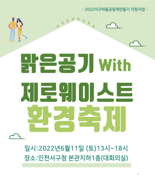 [인천=문찬식 기자] 인천 서구(구청장 이재현)가 오는 11일 서구청 본관 지하대회의실에서 사회적경제조직과 협동으로 ‘맑은공기 위드 제로웨이스트 환경축제’를 개최한다고 밝혔다.