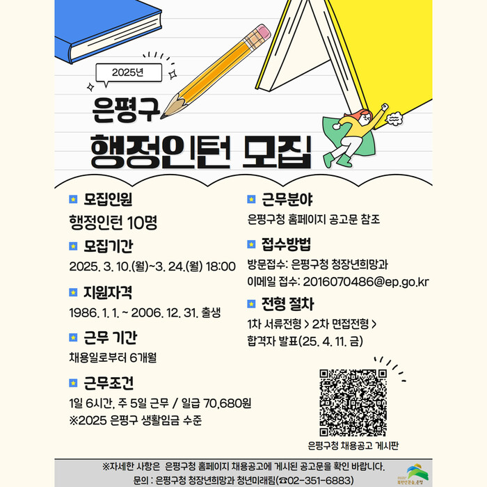 [시민일보 = 이대우 기자] 은평구(구청장 김미경)는 관내 미취업 청년을 대상으로 ‘행정 인턴’ 참여자 10명을 오는 24일까지 모집한다고 밝혔다.