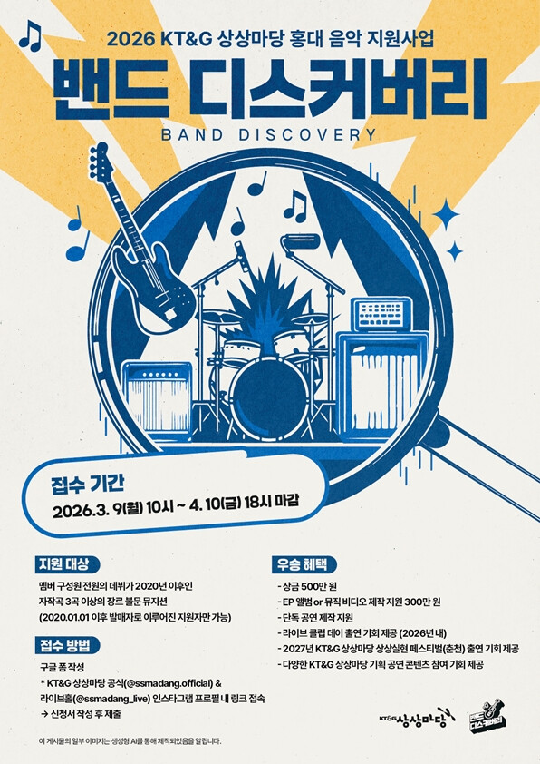 [시민일보 = 문민호 기자] KT&G 상상마당이 인디 뮤지션 발굴을 위한 음악 지원 프로그램 ‘2026 밴드 디스커버리’ 참가자를 오는 4월10일까지 모집한다.