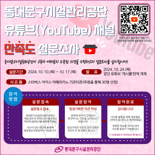 [시민일보 = 이대우 기자] 동대문구시설관리공단(이사장 인택환)이 10월 13일(목)부터 20일(목)까지 유튜브 만족도조사 이벤트를 실시한다.