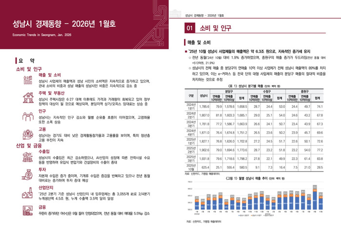 2026년 1월호에서는 성남시 사업체 매출과 시민 소비가 전반적으로 증가 흐름을 유지하는 가운데, 관외 소비 비중이 높은 구조가 지속되는 것으로 나타났다.