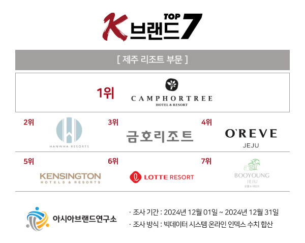 아시아브랜드연구소가 ‘K-브랜드 톱7’ 제주 리조트 부문을 발표해 주목받고 있다.