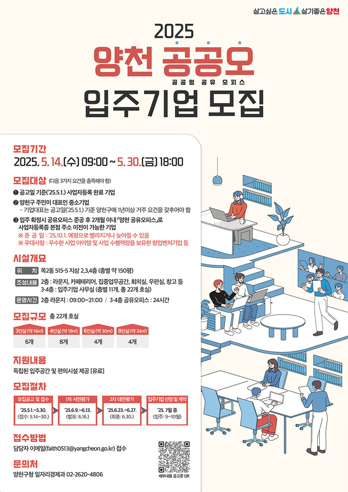 모집 대상은 공고일인 이달 1일 기준 사업자등록이 완료되고, 대표자가 구에 1년 이상 거주 중인 양천구민이어야 하며, 입주 확정 시 공유오피스 준공 후 2개월 이내에 사업자등록증 본점 주소 이전이 가능한 기업이다.
