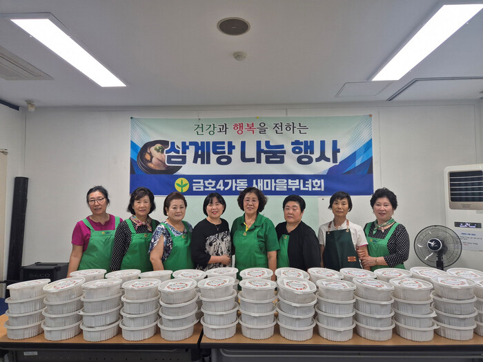 한편 금호4가동에서는 17일 새마을부녀회와 함께 초복맞이 삼계탕 나눔행사를 개최했다. 이번 행사에서는 무더운 여름철 건강이 염려되는 65세 이상 취약계층 노인 100여명에게 직접 조리한 삼계탕을 정성스럽게 포장해 전달했다.