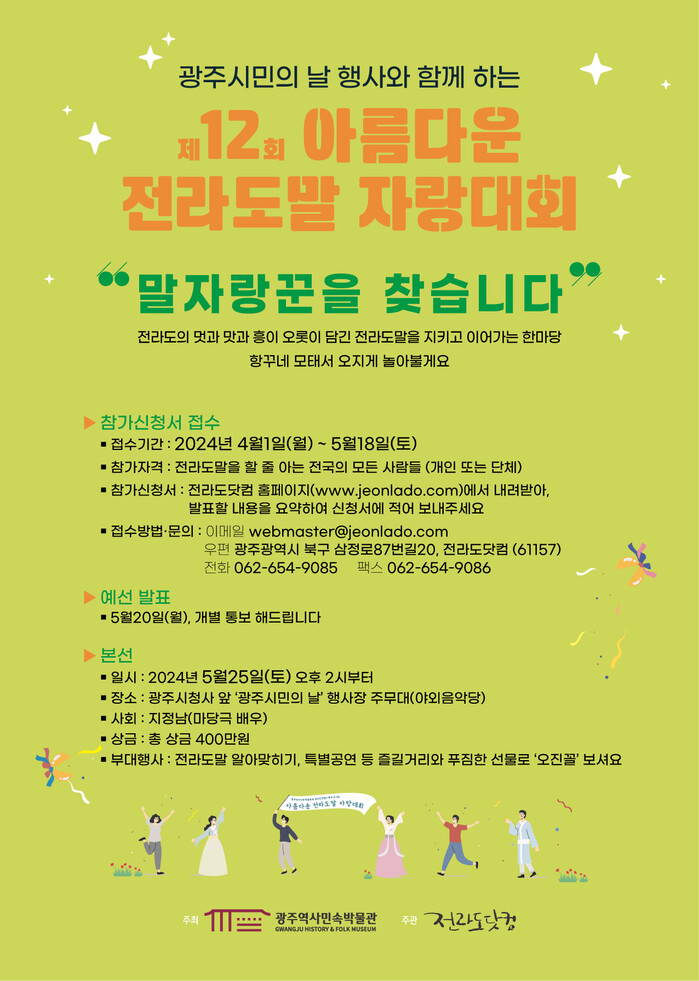 [광주=정찬남 기자] 광주역사민속박물관은 월간 전라도닷컴과 함께 25일 오후 2시부터 광주시청 야외음악당에서 ‘제12회 아름다운 전라도말 자랑대회’를 연다.