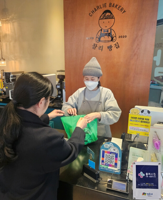 | ▲ ‘성동 원플러스원’에 참여업체를 방문한 손님이 기부하고 있는 모습. (사진=성동구청 제공) |
