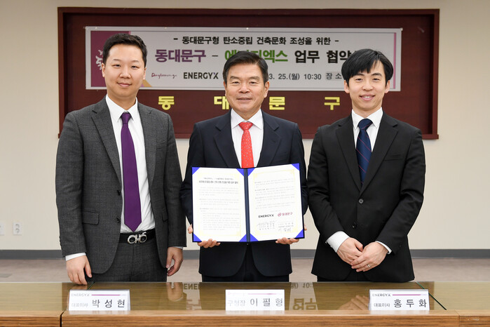 | ▲ 탄소중립 건축문화 조성을 위한 업무 협약식 기념촬영(왼쪽부터 박성현 에너지엑스 공동 대표이사, 이필형 동대문구청장, 홍두화 에너지엑스 공동 대표이사) (사진=동대문구청 제공) |