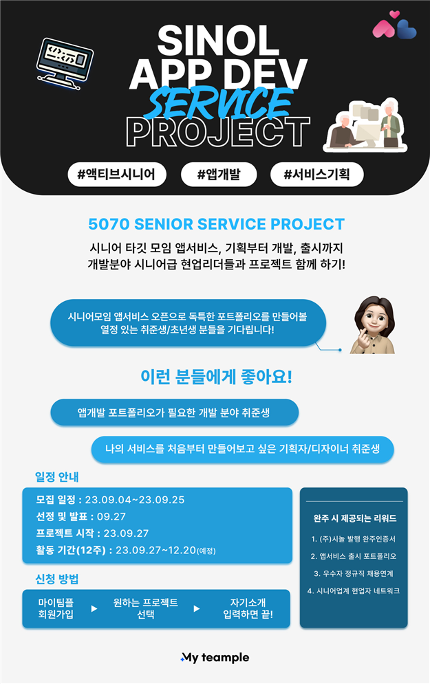 이번 교육프로그램은 5070 '액티브 시니어'를 타깃으로 한 커뮤니티앱을 제작하는 과정으로 직무별 프론트엔드, 백엔드, 기획/QA, UI/UX 디자이너를 모집한다.