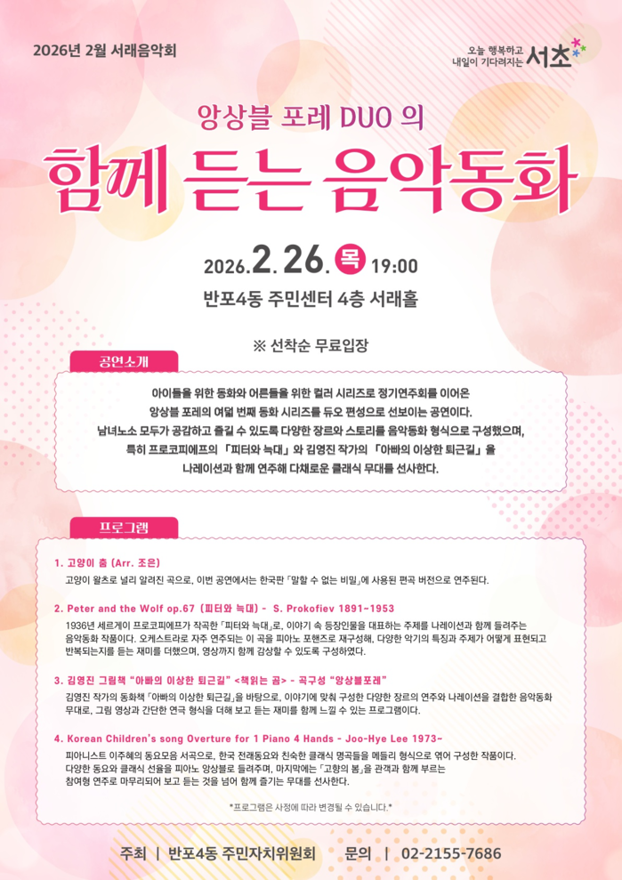 반포4동 주민자치위원회가 주최하는 이번 행사는 피아노 듀오 ’앙상블 포레 DUO‘가 선보이는 음악동화 콘서트로 지역 주민들에게 다채로운 음악적 경험을 제공하고자 마련됐다. 아이들을 위한 동화 형식과 어른들을 위한 클래식 감성을 함께 담아 남녀노소 모두가 공감하고 즐길 수 있는 무대가 꾸며질 것으로 기대된다.