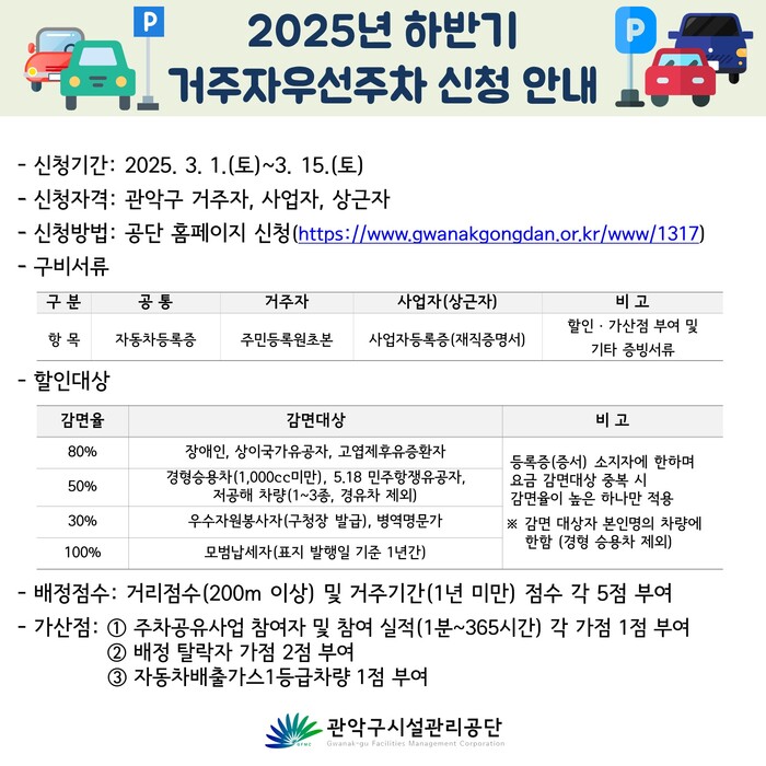 [시민일보 = 문민호 기자] 관악구시설관리공단(이하 공단)이 3월 1일부터 3월 15일까지 2025하반기 거주자우선주차 사용신청 접수를 받는다.