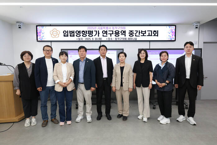 [시민일보 = 여영준 기자] 서울 동작구의회(의장 정재천)가 최근 의회 세미나실에서 그간 입법영향평가 위원회를 중심으로 추진한 ‘입법영향평가 연구 용역’ 추진상황 중간보고회를 개최했다.
