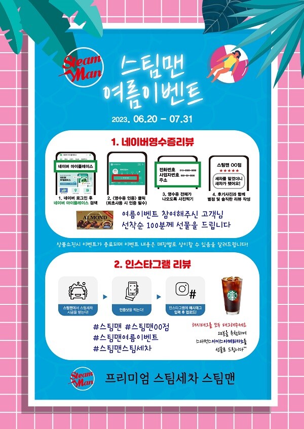 첫 번째는 스팀세차 후 네이버 영수증 리뷰를 작성하면 선착순 100분께 롯데아몬드초코렛을 증정한다. 두 번째는 해시태그와 함께 인스타에 리뷰하면 20명을 추첨하여 스타벅스 아이스 아메리카노를 선물로 제공한다.