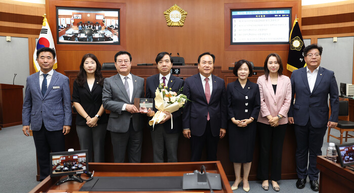 경기 오산시의회가 최근 제287회 임시회에서 강성영 한신대학교 총장을 명예의장으로 위촉했다. 사진은 위촉식에 참석한 이상복 의장(왼쪽 세 번째)이 강 총장(왼쪽 네 번째) 및 참석자들과 기념촬영을 하고 있는 모습. (사진=오산시의회 제공)