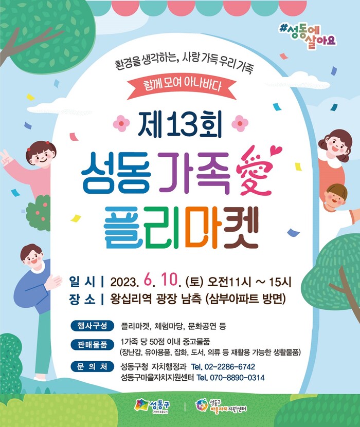 [시민일보 = 홍덕표 기자] 서울 성동구(구청장 정원오)가 오는 10일 왕십리역 남측광장에서 '제13회 성동가족愛 플리마켓'을 개최한다.