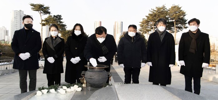 경기 김포시의회가 지난 3일 오전 현충탑 참배에 이어 시무식을 개최했다. 시의회는 마산동에 위치한 현충탑을 찾아 호국영령과 순국선열의 숭고한 희생을 기리며 헌화와 분향을 마친 뒤 청사 본회의장으로 자리를 옮겨 시무식을 진행했다. 사진은 의원들이 헌화와 분향을 하고 있는 모습. (사진제공=김포시의회)