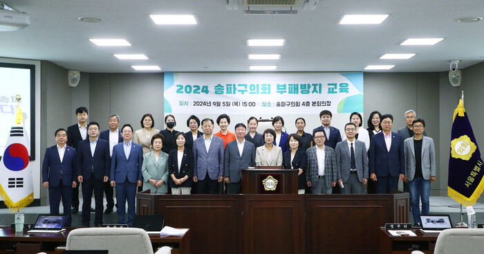 [시민일보 = 이대우 기자] 서울 송파구의회 의원 및 직원 일동이 지난 5일 송파구의회 본회의장에서 실시한 ‘2024년 부패방지교육(청렴교육)’을 이수했다.