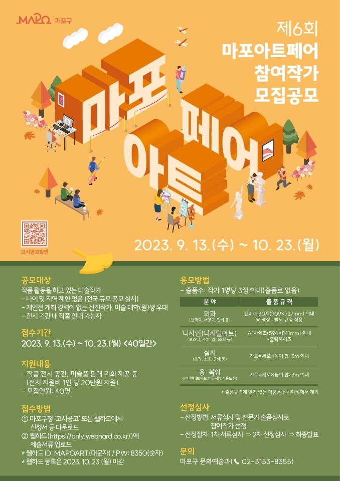 [시민일보 = 홍덕표 기자] 서울 마포구(구청장 박강수)는 오는 10월23일까지 ‘2023 제6회 마포아트페어’에 참여할 미술작가 40명을 모집한다.
