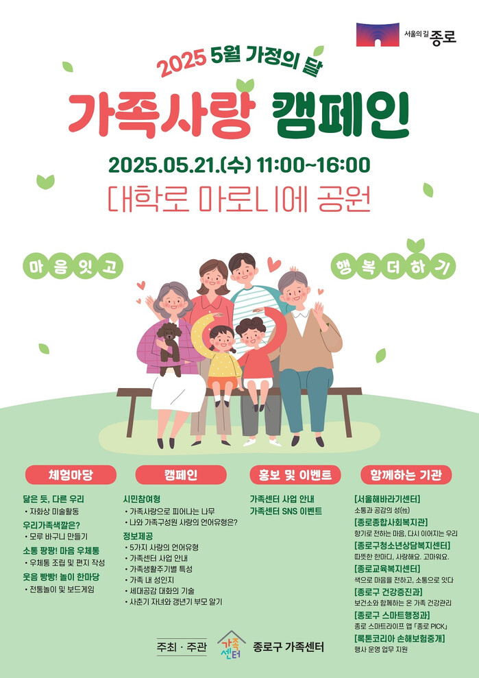 [시민일보 = 이대우 기자] 종로구(구청장 정문헌)가 오는 21일 오전 11시~오후 4시 마로니에공원(대학로 104)에서 ‘2025년 가정의 달 가족사랑 캠페인’을 펼친다.