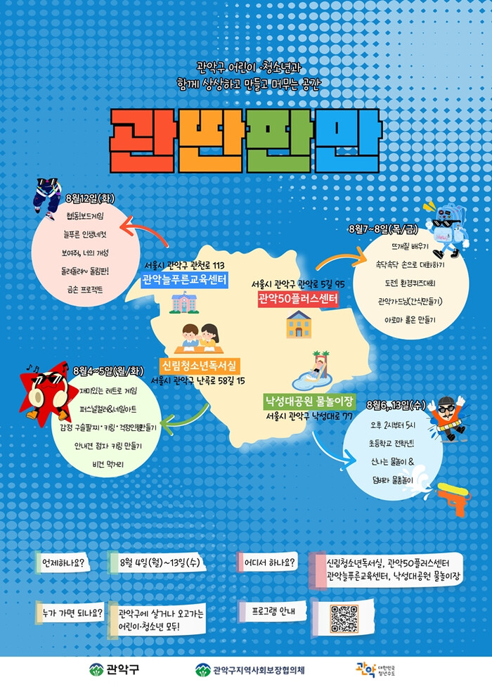 세부 일정 및 장소는 ▲8월 4일~5일 구립신림청소년독서실(난곡로58길 15) ▲8월 6일‧13일 낙성대공원 물놀이장(낙성대로77) ▲8월 7일~8일 관악50플러스센터(관악로5길 95) ▲8월 12일(화) 관악늘푸른교육센터(관천로113)이며, 오후 1시~6시까지 운영된다.