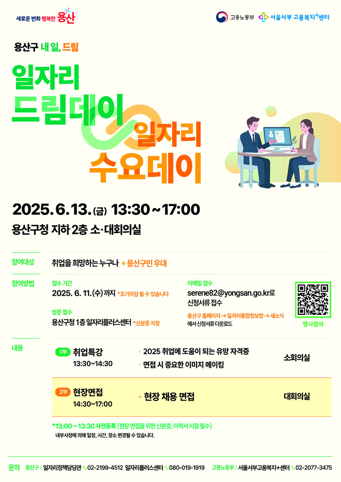 박희영 용산구청장은 “이번 용산구 일자리 드림데이∞일자리 수요데이는 단순한 채용면접에 그치지 않고, 구직자들이 직무 역량을 키우고 실질적인 경쟁력을 높일 수 있도록 특강을 함께 구성했다”라며 “구직 중이신 주민들이 이번 기회를 활용해 꿈을 향해 한 걸음 더 나아가시길 바란다”라고 전했다.
