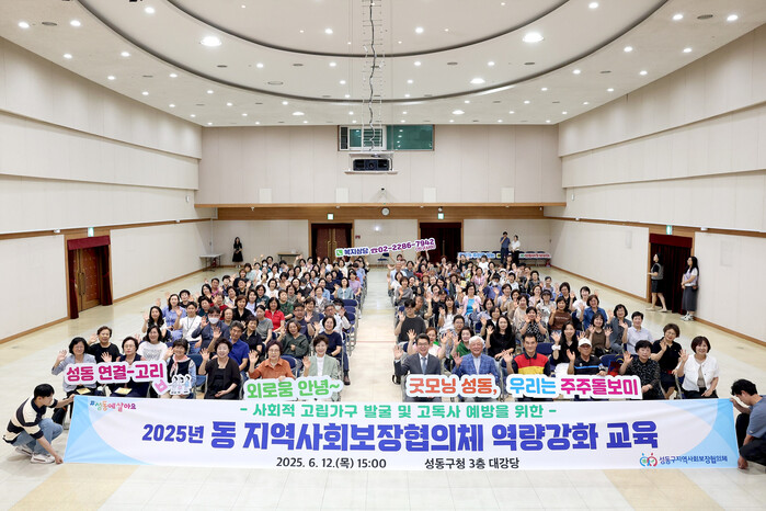 [시민일보 = 박소진 기자] 성동구(구청장 정원오)는 지난 12일 17개 동 지역사회보장협의체 200여명을 대상으로 사회적 고립 등 위기가구 발굴 및 고독사 예방을 위한 '동 지역사회보장협의체 역량강화 교육'을 실시했다.
