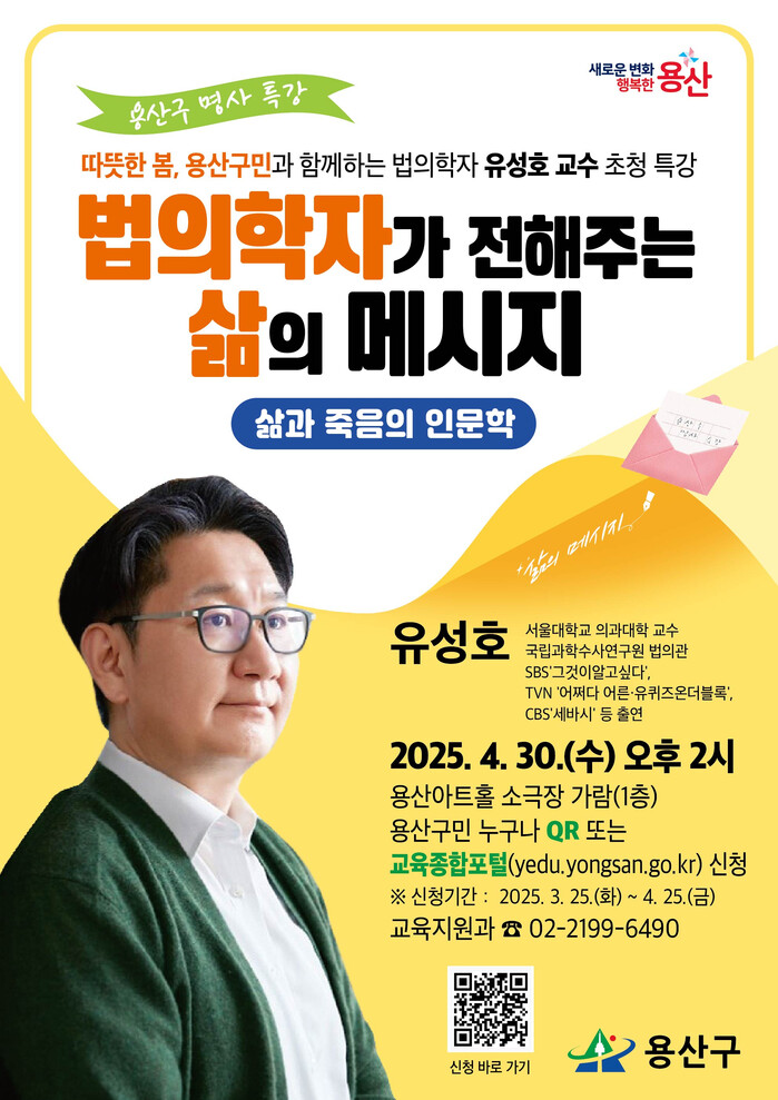 [시민일보 = 문민호 기자] 용산구(구청장 박희영)는 오는 30일 서울대학교 의과대학 법의학교실 유성호 교수를 초청해 ‘법의학자가 전해주는 삶의 메시지’라는 주제로 명사 특강을 진행한다.