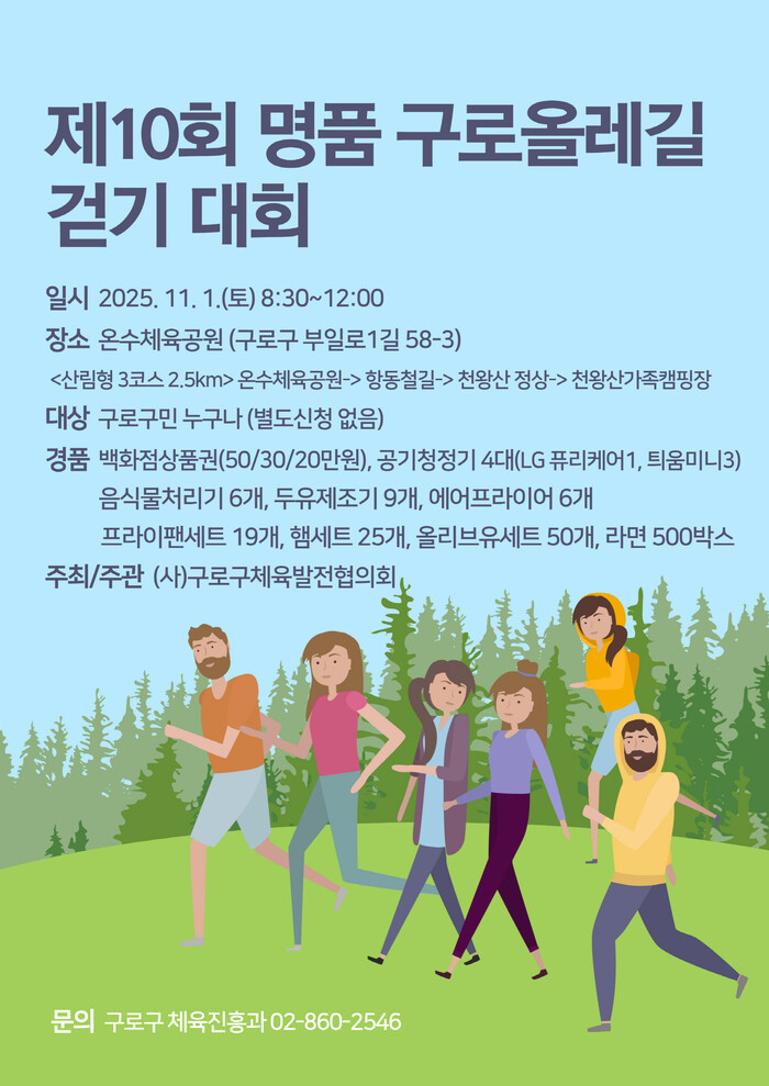 [시민일보 = 박소진 기자] 사단법인 구로구체육발전협의회(회장 김홍수)가 주최, 주관하고 구로구(구청장 장인홍)가 후원하는 ‘제10회 명품 구로올레길 걷기 대회’가 11월 1일 오전 8시 30분 온수체육공원에서 개최된다.